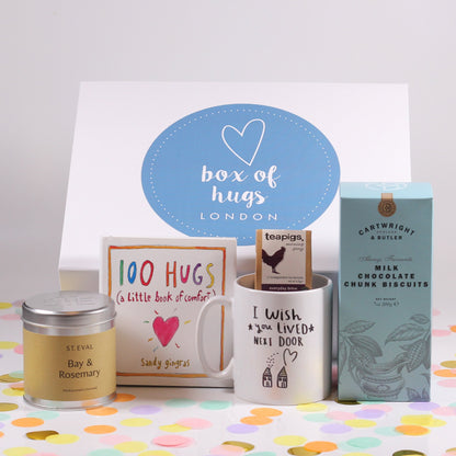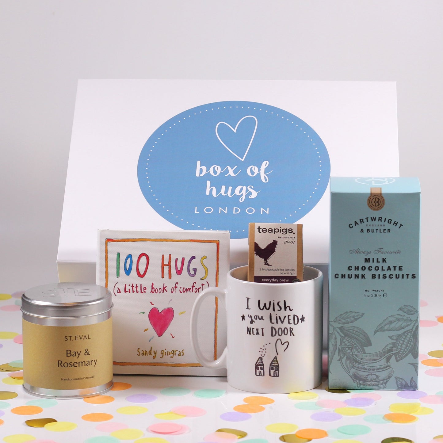 Cheer someone up with a surprise package through the post. This Box of Comfort gift is perfect for letting someone know you care and are thinking of them. It includes a gorgeous Bay & Rosemary scented candle by St Eval which is a Box of Hugs favourite, a 100 hugs book filled with 100 uplifting reminders that hugs are everywhere, a mug of your choice, some tea and of course some yummy chocolate chip biscuits for dunking! It really is a box full of comfort and is guaranteed to raise a smile. A lovely alternative to flowers.