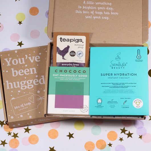 All of the products in our beautiful letterbox boxes have been lovingly selected and are hand packed in a 'You've Been Hugged' disposable box.