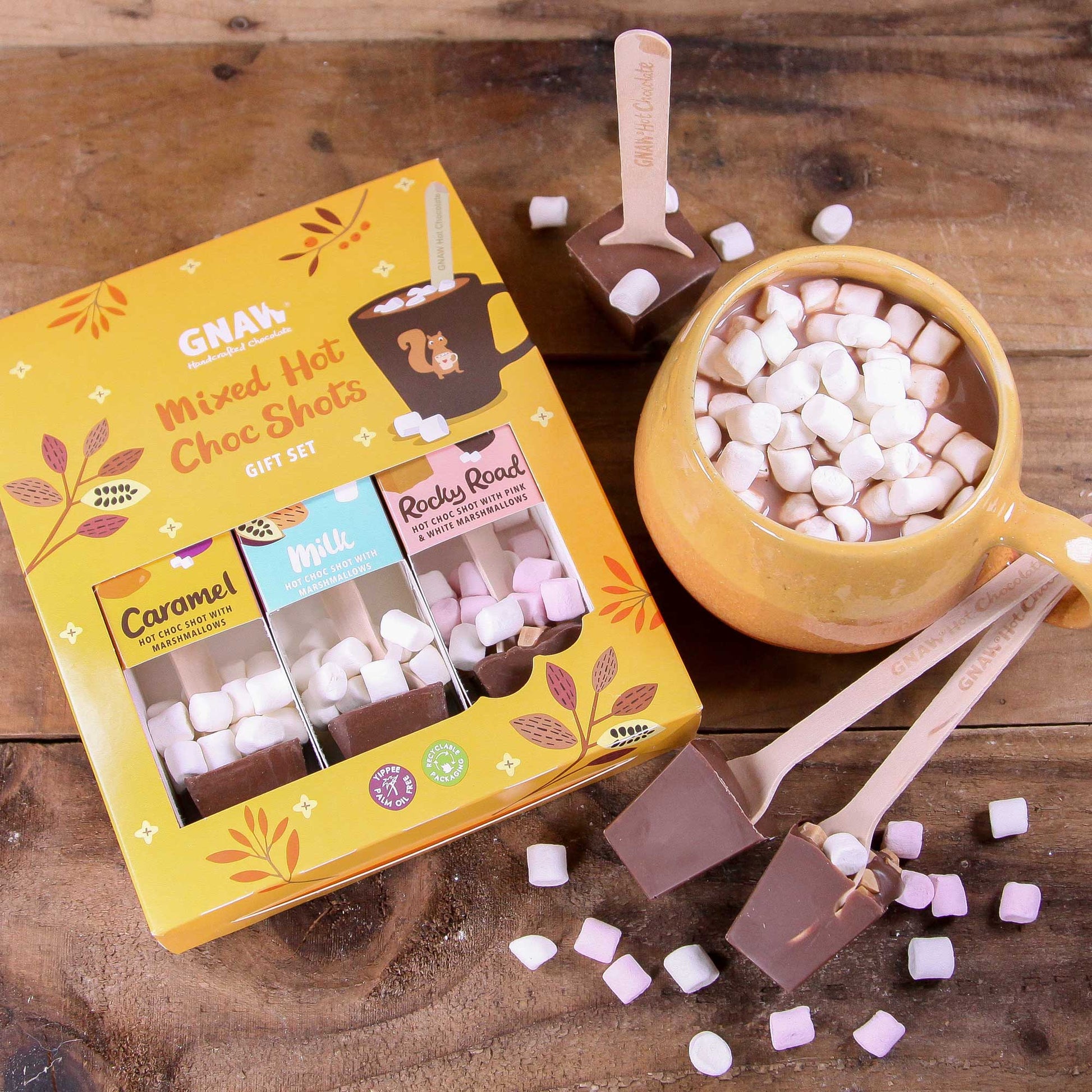 Shoot for the moon and if you miss you’ll be amongst the bars with the Gnaw Mixed Flavour Hot Chocolate Gift Set. A great selection of our fabulous flavoured hot chocolate stirrers including 3 our all-time classic milk chocolate, the sweet velvet touch of caramel and for the adventurous among you the Rocky Road with chunks of fudge and caramel. Treat yourself by melting and swirling a gorgeously delicious chunk of our scrummy chocolate into hot milk, top with mini marshmallows, then sit down relax and enjoy....happy days :)