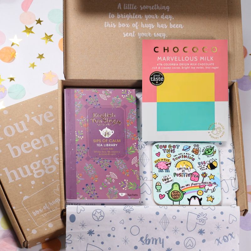 All of the products in our beautiful letterbox boxes have been lovingly selected and are hand packed in a 'You've Been Hugged' disposable box.