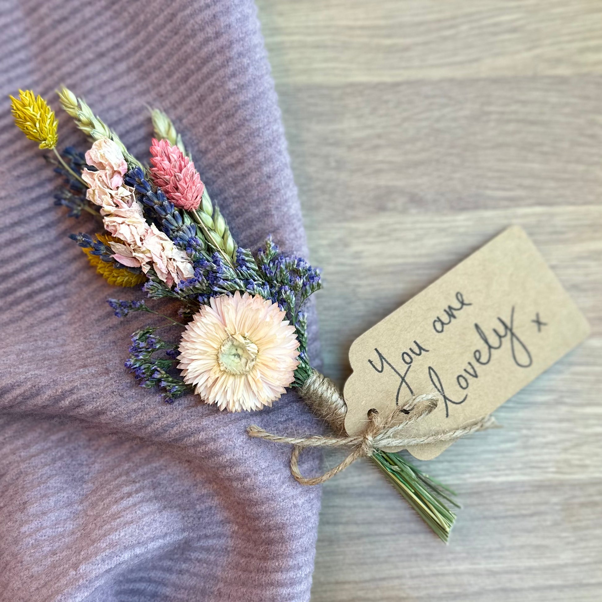 Beautiful dried flower mini posies made with dried flowers with a 'You are lovely x' handwritten tag.